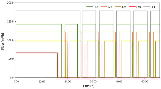 Figure 20 presents total flow for the city center, as well as for tank zones T18 and T19 (pumping group DN800). The city center strictly follows the applied schedule, while water supply in tank zone T19 and especially in T18 exceeds the assigned duration. Tank zones in the eastern part of the city (T22, T23, T24, T61) do not follow the intermittent water supply schedule, while water is pumped to the high-altitude tank zone T25 only during the first 19 h of the crisis (
