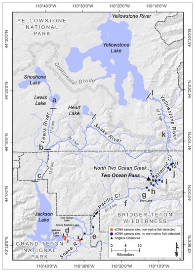 Fishes in rivers and streams of our study area have historically been sampled (intermittently) by biologists using electrofishing gear, angling, or surveys of the angling public [,]. We used environmental DNA (eDNA) [,] as a primary tool to infer fish species presence by detecting its genetic material in water samples. Environmental DNA sampling provides a viable alternative to electrofishing or netting for determining species occupancy [,,]. The use of eDNA is an efficient, non-invasive approach for the broad-scale detection of (potentially) rare or invasive fish species [,,] in large rivers and headwater streams such as those near Two Ocean Pass. A total of 10 eDNA sampling sites were located on the Snake River (downstream of the Jackson Lake Dam), Pacific Creek, North Two Ocean Creek, Atlantic Creek, and the upper Yellowstone River (Sites 1–6 and 8–11; Figure 3). An additional site (Site 7) was used to obtain an eDNA control sample from a fishless reach upstream of a large impassible waterfall on North Two Ocean Creek. The eDNA samples were collected using established protocols [] during 6–11 July 2019 using individual sterile sample kits and a peristaltic pump (Geotech Environmental Equipment, Inc) to filter about 5 L of water through a 1.5-µm glass microfiber filter (Whatman® 1827-047 Glass Microfiber Binder-Free Filter) for each sample. The eDNA samples were extracted and then analyzed in triplicate using quantitative polymerase chain reaction (qPCR) to detect DNA from the target species. All samples were analyzed using established protocols, including the use of a negative control on each PCR plate, at the National Genomics Center, United States Forest Service, Rocky Mountain Research Station in Missoula, Montana, USA []. The amplification was done by a single-species approach using specific primers [] for each, including cutthroat trout, brook trout, brown trout, lake trout, and rainbow trout O. mykiss, a harmful nonnative that occurs in the Snake River system downstream of Jackson Lake Dam []. We assumed presence based on minimum genetic evidence. A sample was considered positive if at least one reaction in the triplicate was positive for the target eDNA after 45 PCR cycles []. With the exception of lake trout, samples were not run with a standard curve [,].