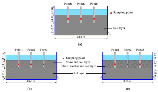 A schematic diagram for the experiment treatments: (a) No wheat straw returning (CK); (b) Wheat straw returning (ST); and (c) Both wheat straw and biochar returning. Point1, point2 and point3 represent the 0–10 cm soil water sampling point, which is repeated three times.