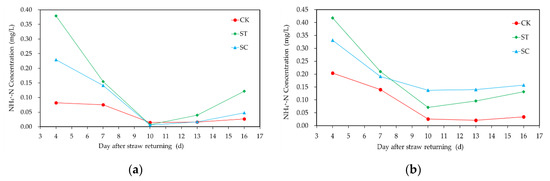 Figure 3 shows the NH4+-N concentration at surface water and 0–10 cm soil water under different treatments. Results show that NH4+-N concentration decreased rapidly due to ammonia volatilization, microbial digestion and nitrogen infiltration during the first 10 days after straw returning [40,41]. With the consumption of oxygen, the content of dissolved oxygen in water decreased gradually, and the denitrification intensity was gradually stronger than the nitrification intensity. Under anaerobic condition, the denitrification produces N2O, N2 and a small amount of NH4+-N. Therefore, the NH4+-N concentration under the three treatments increased slowly after the 10th day of straw returning.