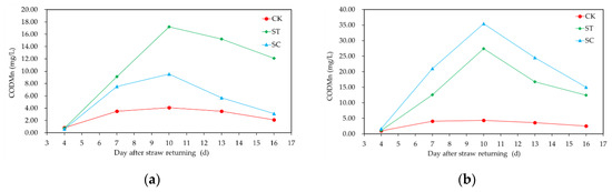 For the surface water, the difference of CODMn among the three treatments was significant in different time, showing ST > SC > CK (Figure 4a), which indicated that CODMn content in surface water increased after straw returning. As the straw decomposed, the CODMn difference in surface water between the ST and SC treatment increased gradually. In the rising stage, the increment of CODMn in surface water under ST treatment was higher than that in SC treatment, while the decrement under ST treatment was lower than that in SC treatment in the declining stage. For the 0–10 cm soil water, the CODMn under ST and SC treatments was different to the surface water. The CODMn under SC treatment was always higher than that in ST treatment, and the peak value of CODMn in SC treatment was 35.46 mg/L, which is 29.48% higher than in ST treatment.