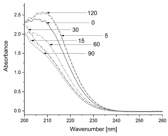 The UV absorption spectra invariantly demonstrated the band at 220 nm which resulted from the 1A1 → 1B1 transition [24] (Figure 1). In the spectrum of water saturated with methane prior to the treatment with GP, that band of absorbance of about 2.4 a.u. showed a vibrational structure resulting from simultaneous low transmissions in both light beams. The GP treatment for 5 min elevated the maximum of that band up to about 2.6 a.u., accompanied by a subtle 10-nm upshift. The spectrum of the water treated for 120 min perfectly fitted the same pattern of that band. Prolonged treatment led to a decrease in the intensity of that band to an extent providing a less intensive shoulder of the Reyleigh scattering band with its maximum below 200 nm. The intensity of that shoulder depended on the treatment time. It decreased in the order: treated for 60 min > for 30 min > for 90 min. That is along the increasing ordering and rigidity of the macrostructure.