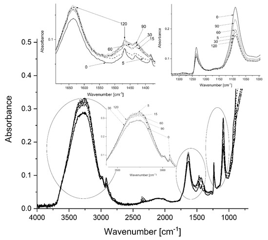 The FTIR-ATR absorption spectra (Figure 2) demonstrated an increase in the intensity of the νOH band centered around 3250 cm−1. That increase reflected some deterioration of the macrostructure releasing an increasing number of the hydroxyl groups not engaged in the formation of intermolecular hydrogen bonds. Differences in the absorbance of that band in the spectra of the GP-treated water were fairly subtle, but an insight in these spectra showed that it decreased as a consequence of the treatment time in the order: 120 min > 5 min > 30 min > 60 min > 15 min > 90 min. Absorbance of the νOH around 1650 cm−1 changed in a similar order. Absorbance of the bands which could be assigned to the C–H vibrations and bending in the molecules of methane, that is, the bands at ~2900, 1400, 1200, and 1100 cm−1 decreased with the treatment time. Again, the decrease was not linear against the treatment time, which meant that methane was somehow incorporated into the water macrostructure.