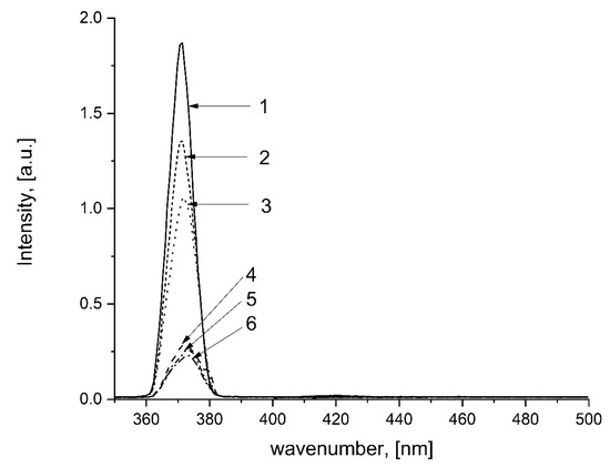 In the case of water treated with GP in the air [1], under ammonia [8], and nitrogen [9], based on the Raman spectra, the formation of aqueous clathrates of the corresponding gases was postulated. The appearance of the bands centered around 400 nm (5303 cm−1 Raman shift) following the intensive band at around 370 nm (3276 cm−1 Raman shift) was the criterion for the clathrate formation.
