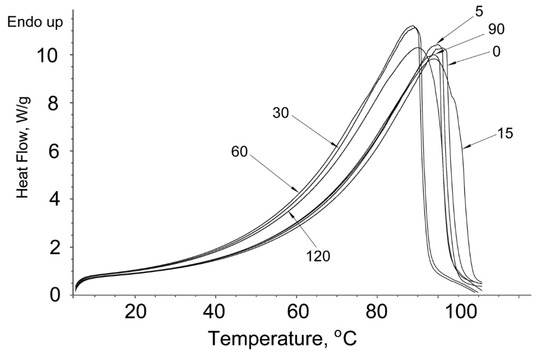 However, this order did not fall in line with the order of the thermal effects observed in the DSC measurements (Figure 5 and Table 1). The orders of the treatment time-dependent thermal effects