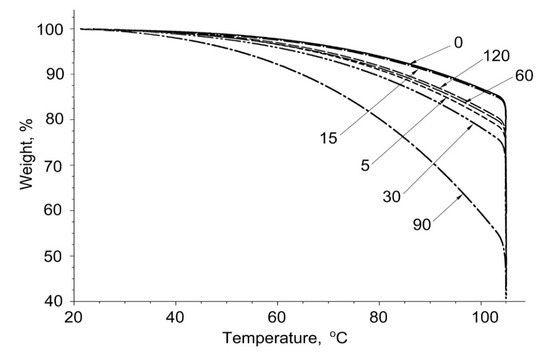 Thermogravimetric measurements threw a light on the solubility of methane in water depending on the treatment time (Figure 7). The thermogravimetric curves did not provide any signal related to the temperature-dependent evolution of methane from particular samples. Instead, clear differences in the sudden loss of the weight above 100 °C could be seen and the magnitude of that loss for depending on their GP treatment time increased in the order: