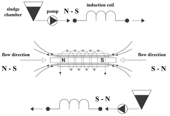 Two combinations of sludge flow through the coil were used: In the direction of the magnetic field lines (flow S–N) and opposite to the direction of the magnetic field lines (flow N–S).