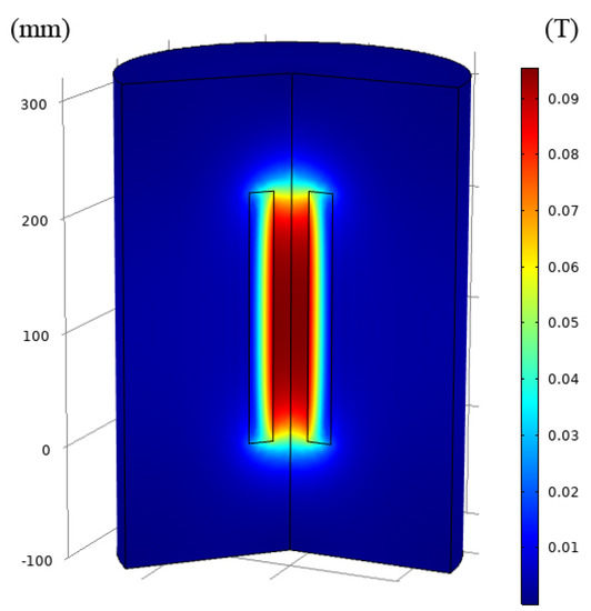Calculations of magnetic induction (based on geometric, material, and electrical specifications of the coil) were made using the Comsol Multiphysics 5.2a software (Jaarbeurs, Utrecht, The Netherlands [21] (Figure 2). The magnetic field induction inside the solenoid was measured using a Teslameter Phywe sensor (Wuntronic GmbH, Munich, Germany) and was consistent with the calculations.
