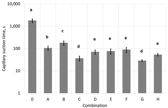 The basic evaluation of susceptibility to dewatering of the conditioned sludge is based on the results of capillary suction time (CST) measurement (Figure 3). The use of polyelectrolyte (combinations A and B) in sludge conditioning led to more than 10 times faster sludge dewatering compared to untreated sludge (combination 0). The most effective method of sludge preparation was the dual chemical conditioning method (combinations C and D). The exposure of dually conditioned sludge to the magnetic field did not significantly change the dewatering capacity.
