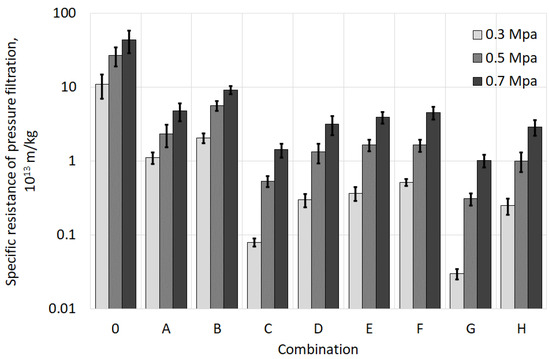 During sludge dewatering using a pressure filter press, a decrease in sludge filterability was observed, along with an increase in the filtration pressure (Figure 5). This effect was independent of the conditioning combination. With regard to dewatering efficiency, the use of dual conditioning (C and D) was more beneficial than conditioning only with the polyelectrolyte (A and B). However, sludge filtration at a pressure higher than 0.3 MPa resulted in exceeding the filterability limit (the sludge with a specific resistance of less than 5.0 × 1012 m/kg is considered susceptible to filtration [23]). For example, the specific resistance to filtration of the sludge prepared using the dual chemical method (C) and filtered at a pressure of 0.3 MPa was 0.07 × 1013 m/kg, whereas at a pressure of 0.7 MPa, the resistance increased 20 times (r = 1.43 × 1013 m/kg). The advantage of triple conditioning (coagulant–polyelectrolyte–magnetic field) over other methods of sludge preparation was only significant in the case of the combination G (r = 0.03 × 1012 m/kg). The specific resistance of filtration of the sludge conditioned using the combinations E, F, and H was close to the level characteristic for the combination D.