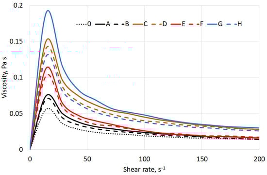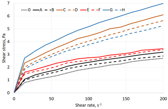 Two groups can be distinguished based on the measurements of viscosity and shear stress versus shear rate (Figure 7). The first is a group of conditioning combinations G, C, D, and H with higher values of viscosity and shear stress. These methods of conditioning affected the increase in resistance to shearing forces. The second group is conditioning combinations: 0, A, B, E, F. Both groups can be classified as shear-thinning fluids (n < 1).