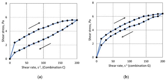The occurrence of the hysteresis loops and consequently the lack of overlapping of flow curves with increasing and decreasing shear rates was a general manifestation of the instability of the tested sludge. Based on the plotted hysteresis loops, it was found that the tested sludge is a thixotropic fluid, with its viscosity depending on the rate and time of shear and decreasing under shear. Partial destruction of the sludge structure is observed with the increase in shear rate, which is reflected by the upper curve of the hysteresis loop, whereas the lower curve represents partial remodeling of the structure at a decreasing shear rate. To graphically illustrate the resulting hysteresis loop, only two graphs are provided for the combinations C and G (Figure 8).