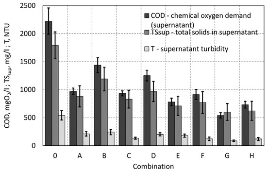 The chemical oxygen demand of the supernatant after sludge conditioning with the combination G was 540 mg O2/L, whereas in the case of combination A (optimal polyelectrolyte dose), COD was 970 mg O2/L (Figure 9).