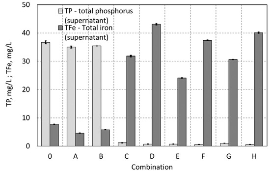 A significant difference was observed in the concentrations of total phosphorus (Figure 10). Combinations of sludge conditioning based on the dosing of PIX-113 and action of the magnetic field led to a significant reduction of phosphorus concentration in the supernatant. The concentration decreased from about 35.0 mg/L (0–B) to 0.8 mg/L (C–H).