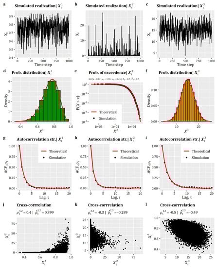 It is noted that, for the sake of convenience, the above guide regards the simulation of homogenous, stationary, and isotropic RFs, yet it can be easily adopted to account for anisotropy and cyclical stationarity. Particularly, the former one can be accomplished by using either appropriate coordinate transformation functions (e.g., [109]) or by directly employing anisotropic correlation structures [58,110,111], while the latter one by cyclically varying the parameters of the marginal distribution and those determining the process’ spatiotemporal correlation structure.
