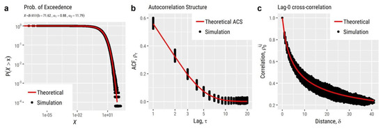 Further to marginal distributions, anySim currently implements three correlation structures (CSs), i.e., , where a is an index that could denote either the separation distance (typically Euclidean) of two points in space (hereafter, we use the letter for that case) or the time lag (in this case, we use the letter ). In the former case, we refer to it as the cross-correlation structure (CCS; i.e., spatial) of the process, while in the latter as the auto-correlation structure (ACS; i.e., temporal).