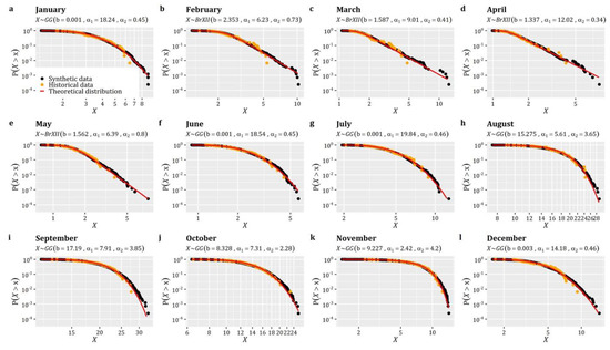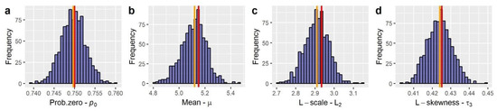 where is a parameter controlling the inflation of zeros (i.e., the discrete part of the distribution – the probability of observing zero values) and denotes the distribution to be inflated (i.e., the continuous part of the distribution). The combination of this distribution with Nataf-based models for simulating intermittent processes (i.e., rainfall) was recently formalized in [72], as well as employed by other works [20,25,78,79]. Earlier hydrology-related applications that couple Nataf-based schemes (although not recognized as such at the time) with this distribution model can found in the works of Bell [68] and Lanza [69] conducted in 1987 and 2000 respectively, who used a zero-inflated distribution in combination with a the log-Normal one for the continuous part. Further details on the distribution can be found in the work by Aitchison [121], as well as that of Kedem et al. [120], who among others provided the relationships that give its product moments. It is also noted that the model can be combined with a two-component mixture distribution for the description of the continuous part of the process, enabling the distinct modeling of the main body and the tail behavior of the distribution [20,93].