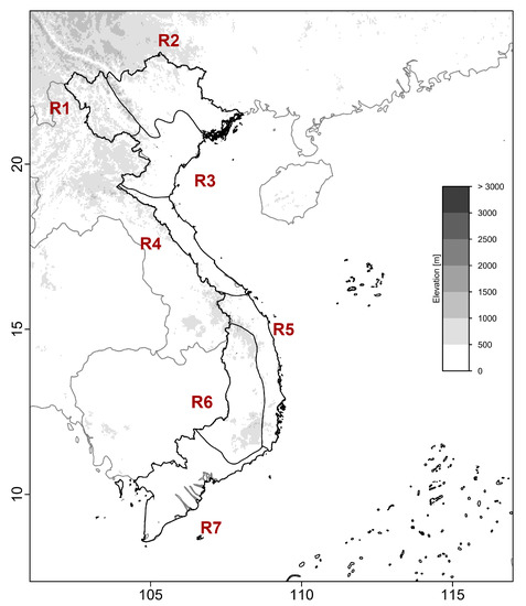 The seven climate regions of Vietnam (polygons bounded by black lines) as defined in the Vietnam Hydrometeorological Atlas. The elevation across these regions is also shown for reference.
