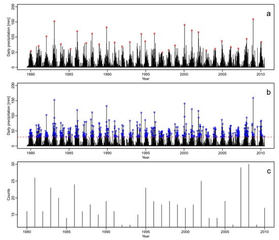 An example of deriving the annual maxima precipitation (PMAX) and heavy precipitation days (N95) time series from daily precipitation. (a) Daily time series (black histogram) and the PMAX events (red dots). (b) Daily time series (black histogram) and the peak-over-threshold events (blue dots); the horizontal dashed line represents the threshold (the 95th percentile of the empirical distribution). (c) The values of the N95 variable (i.e., the number of heavy precipitation days per year; heavy precipitation events were identified in Figure 2b).