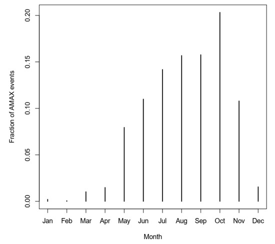 Fraction of annual maxima precipitation events across Vietnam classified into each calendar month. The period from July to October, in which about two-third of annual maxima precipitation events are concentrated, was used to derive yearly time series of climate indices.