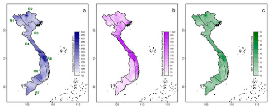 Characteristics of precipitation across Vietnam: (a) average annual precipitation, (b) average annual maxima precipitation, and (c) the 95th percentile threshold. Seven climate regions are also shown as polygons bounded by black lines.