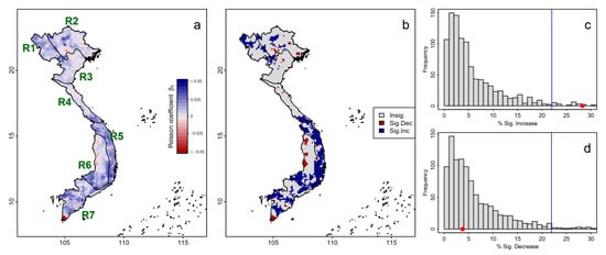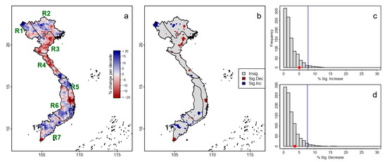Figure 5 shows trends of annual maxima precipitation across the country mainland, over which approximately 52% grid cells exhibits an increasing trend (Figure 5a). At regional scales, Red River Delta (R3) and North Central (R4) are dominated by a decreasing trend, while increasing trends appear more notably over the Northeast (R2), Central Highland (R6) and South (R7) regions. In addition, a mixture of both increasing and decreasing trends is apparent over the Northwest (R1) and the South Central (R5), indicating the spatially heterogeneity of changes in the magnitude of precipitation extremes. These results are generally consistent with a previous investigation using gauged rainfall from 1979 to 2012 [34], indicating the robustness of PMAX trends detected using different datasets. More importantly, more than 90% of Vietnam’s landmass is not associated with a significant trend (Figure 5b). Of all grid cells, only 5.0% (3.6%) exhibits significant increasing (decreasing) trends at the 5% level and this result is not field significant (Figure 5c,d).