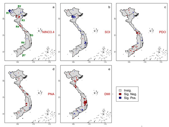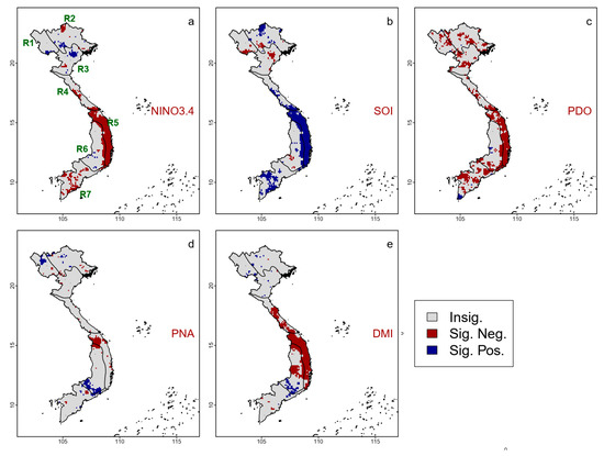 The spatial variations of the relationships between PMAX and the five climate indices are shown in Figure 7. At the national scale, less than 10% of Vietnam’s mainland is associated with significant (either positive or negative) relationships between PMAX and each of the five climate indices. Of all indices, DMI has the most notable negative relationships with PMAX (Figure 7e); having 7.3% of all grid cells shows a significant negative relationship, and this number is field-significant (Table 2). Among the other four climate indices, the SOI index shows an overall positive relationship with PMAX (Figure 7b), while a mixture between local negative and positive relationships is apparent across the other three indices (Figure 7a,c,d).