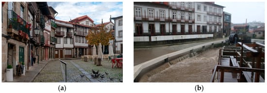 The Historic City Centre of Guimarães: (a) View to one of its squares; (b) Example of a flood event in the Couros’ river basin (source: Guimarães City Council).