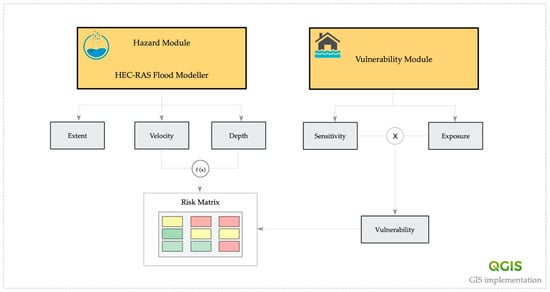 To better explain the methodological framework adopted in this work, this section presents and discusses the fundamentals of the applied flood risk assessment method. As schematically illustrated in Figure 2, the approach is composed of two main modules, the hazard and the vulnerability module. The bases of these two modules are detailed in Section 3.1 and Section 3.2. Finally, Section 3.4 introduces the study area and the approach adopted in this research to collect, manage, and explore data.