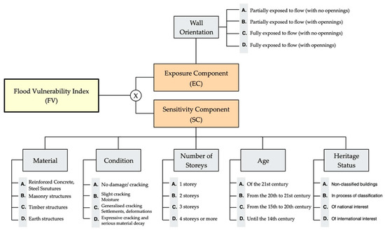 Flood vulnerability is assessed through the application of the simplified flood vulnerability assessment methodology, which was initially proposed by Miranda and Ferreira [6]. This methodology consists of the evaluation of two vulnerability components, an exposure and a sensitivity component (Figure 2), which, through an index, quantify the vulnerability of the building to flood inundation.