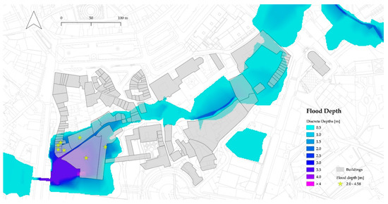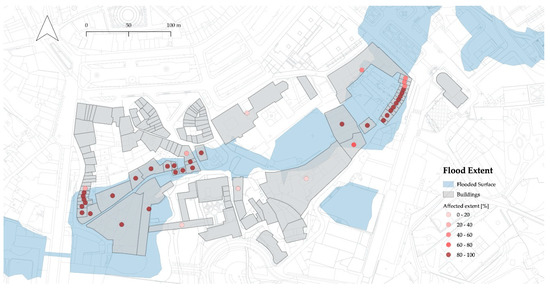 Of these 41 buildings, 23 are affected to the fullest extent, whereas the other 18 are partially flooded, see Table 3. In absolute numbers, about 11,000 m2 of a total of about 32,000 m2 of built-up area are affected, which corresponds to about 34%.
