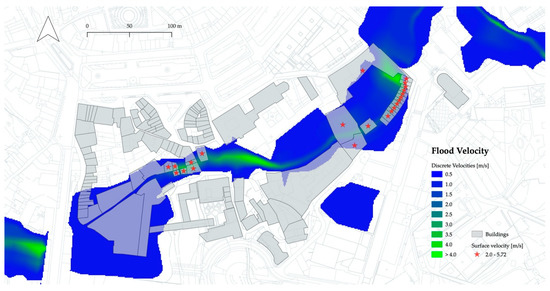 Concerning the flood velocity, presented in Figure 5, it ranges between 0.01 m/s and 5.72 m/s. The average velocity value at the surface of the 41 buildings affected by the flood is about 2.15 m/s—with a standard deviation value (STD) of 1.68—being that 22 of these 41 building are exposed to surface velocities higher than 2 m/s. As can be observed in Figure 5, there are two blocks that are particularly affected: one located in the northeast zone (15 buildings) and the other roughly at the central zone of the study area (7 buildings).