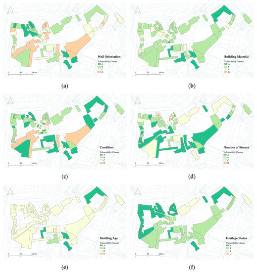 Mapping of the spatial distribution of the vulnerability classes: (a) Wall Orientation; (b) Building Material; (c) Condition (or conservation status); (d) Number of Storeys; (e) Building Age; (f) Heritage Status.