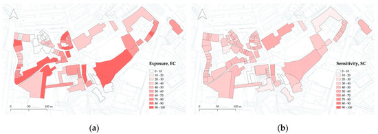 When getting into the discrete exposure, sensitivity, and vulnerability results, it is possible to gain a much better understanding of the overall vulnerability of the buildings. As illustrated in Figure 8a,b, respectively, spatial analysis reveals a scattered distribution of exposure and the sensitivity indicators over the study area. Comparatively, it is also clear that the exposure values are generally higher than sensitivity values. Despite this, and although there is no correlation between these two indicators, it is interesting to see that some of the most exposed buildings are also those that revealed to be more sensitive. This cross analysis is presented in Figure 9a, where we identify the buildings to which the exposure and the sensitivity values are cumulatively higher than 40. For vulnerability reduction purposes, these buildings are the most critical ones.