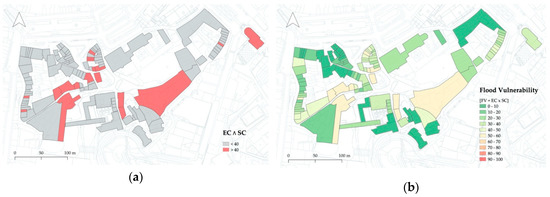 For simplicity’s sake, the values of these three indices (EC, SC, and FV)—which range, respectively, from 10 to 100, 50 to 500, and 500 to 50,000—are normalised to fall within the range of 0 to 100; the lower the value of the index, the lower the level of exposure, sensitivity, or vulnerability of the building. According to Miranda and Ferreira [6], despite the fact that this approach was primarily intended for assessing the flood vulnerability of single buildings, its simple formulation makes it particularly suitable to evaluate large urban areas, such as historic city centres. It is precisely in this context that we apply this methodology herein.