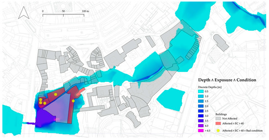 Justifying the three indicators considered herein, Figure 10 presents the map resulting from their integrated analysis. We want to highlight a couple of interesting conclusions from the analysis of this map. The first one is the identification of highly-exposed buildings (i.e., with an EC value higher than 40) that, for the adopted 100-year peak flow scenario, are subject to a water depth over 2 m. Based on this first criterion, it is possible to identify six buildings—about 5% of the building stock within our study area—which are highlighted in red in Figure 10. However, when including the conservation state into the analysis, this number can be further reduced to 5 (about 4% of the building stock), making this result even more informative for decision-making purposes.