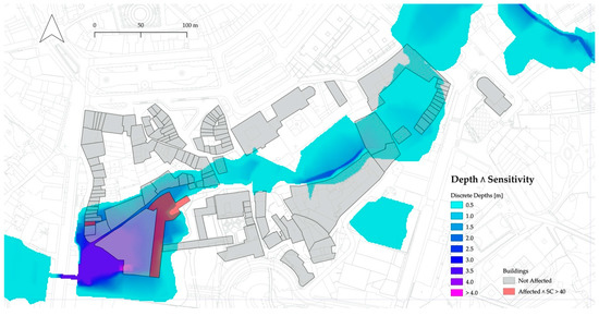 As can be inferred from the analysis of Figure 11, the number of buildings identified from the joint analysis of the water depth and the buildings’ sensitivity (for the very same 100-year peak flow scenario) is reduced to 2, which is a little less than 2%. It is also interesting to note that these two buildings are among the five already identified in Figure 10, which, from a decision-making standpoint, pushes them to the top of the intervention priorities.