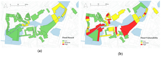 Spatial distribution of the flood hazard (a) and flood vulnerability results (b).