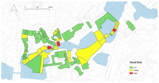 The present article addresses this challenge by discussing the application of an integrated flood risk assessment approach, which combines flood hazard and building vulnerability indicators to identify and classify risk and to narrow intervention priorities. The Historic City Centre of Guimarães (Portugal)—a World Heritage Site inscribed by UNESCO since 2001 due to its extraordinary authenticity and well-preserved condition—is explored here to illustrate the application of the methodology. After modelling the flood hazard using the hydrologic–hydraulic method and evaluating the flood vulnerability of the buildings by resorting to a simplified vulnerability assessment method, we provide a comprehensive analysis of the outputs, both in an individual and integrated manner. Finally, we used a risk-matrix approach to aggregate these hazard and vulnerability outputs and categorise the buildings into three qualitative levels of risk.