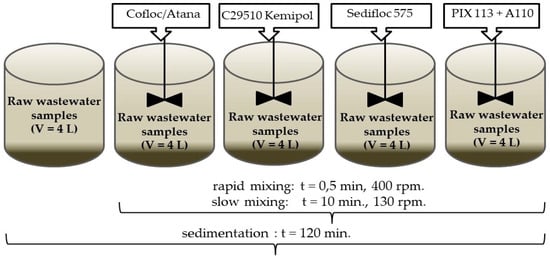 In order to determine the effectiveness of pollutant removal in the process of CEPT, laboratory tests were carried out with wastewater without primary precipitation (only after 2-h of sedimentation) and after coagulation with the addition of organic and inorganic coagulants (Figure 1).