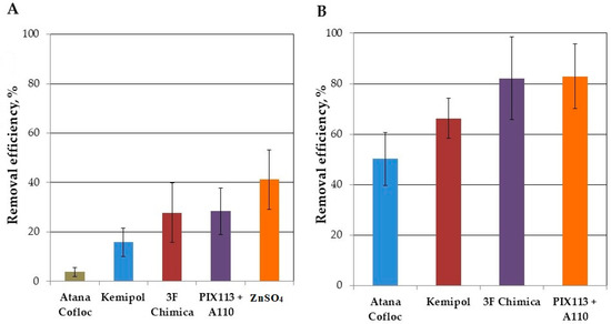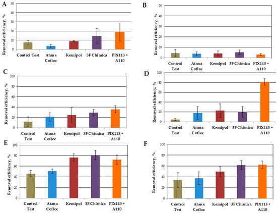 With respect to TN, only the use of 3F Chimica organic coagulant and PIX 113 coagulant together with the A110 polyelectrolyte contributed to a significant increase in its removal (14.5% and 19.0%, respectively) (ANOVA, p = 0.111) (Figure 2A). With respect to PIX113, it has been shown that a dose of 100 mg/L enabled the removal of dissolved (below 0.1 μm) and colloidal (from 0.1 to 1.2 μm) fractions of organic nitrogen contained in biologically treated wastewater with an efficiency exceeding 10% [26]. The same effect may also occur in the case of raw wastewater, as indicated by the greater efficiency of dissolved fraction of organic compounds removal (dCOD, above 0.45 μm) for both of these coagulants. The effect of dosing coagulants on the final concentration of ammonium nitrogen was negligible (Figure 2B).