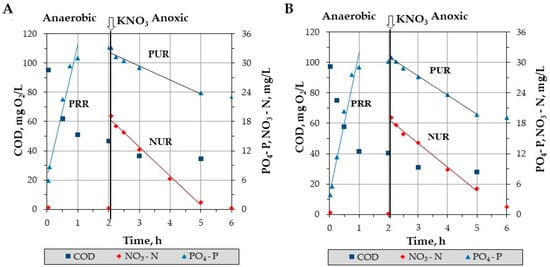 The rate of phosphate release under anaerobic conditions (PRR) and the uptake of phosphate under anoxic conditions (PURANOX) were calculated according to Formula (1) and the rate of denitrification under anoxic conditions according to Formula (2):