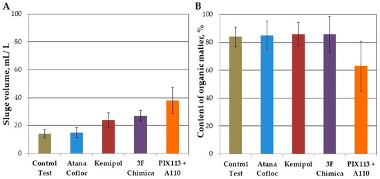 Sludge separated in the chemically enhanced primary treatment (CEPT) process (A) volume after 2-h sedimentation, (B) organic matter content.