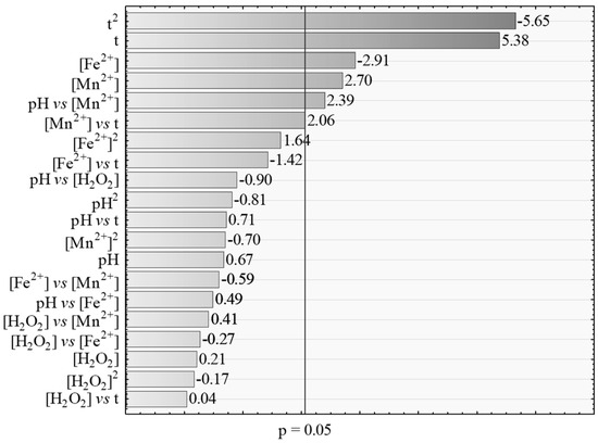 According to the observation of the Pareto Graph (Figure 1), regarding the experimental design (Box–Behnken) used on this experiment to analyze the TMP degradation, it was found that the variables which had higher efficiency (significant effect) were the t (reaction time) quadratic and linear effect, [Fe2+] linear effect, [Mn2+] linear effect, and the interaction pH vs. [Mn2+].