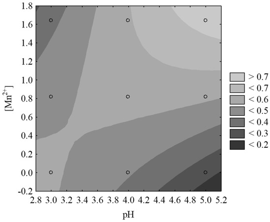 Graph of contours of the TMP relative concentration (C/C0) as resulting from variable interaction [Mn2+] and pH ([H2O2] = 4.41 mmol L−1, [Fe2+] = 0.81 mmol L−1, t = 60 min).