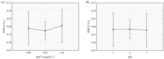 Graph of the global average of relative concentration of SMX in all the runs conducted, for the three levels tested of (A) Mn2+ and (B) pH.