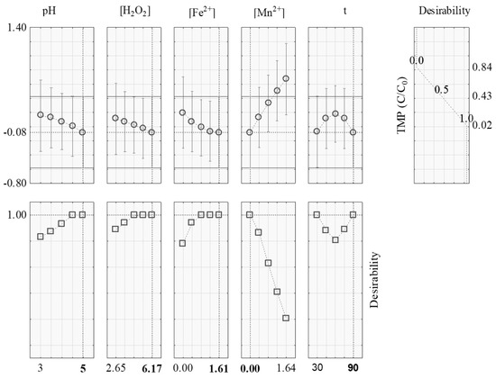 In Figure 5, it may be seen that for [Fe2+] and time, there is more than one value for the maximum condition of desirability. Therefore, the best efficiencies on TMP degradation are obtained below pH 5, [H2O2] between 4.41 and 6.17 mmol L−1, [Fe2+] between 0.81 and 1.61 mmol L−1, [Mn2+] at 0.00 mmol L−1 and t of 30 and, or, 90 min.