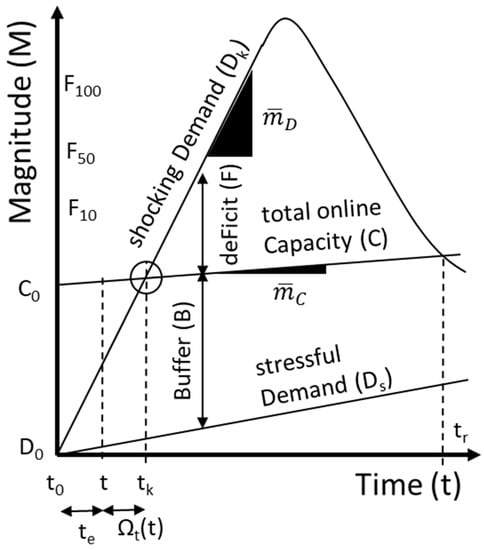 Illustration of the geometry of a shock, including the role of buffers and deficits, the transition from stress to shock (and recovery) at some future point in time, and ramp rates of demand and of capacity. Note that excess demand is curtailed to equal capacity during a shock, creating damage and that deficits can therefore only exist as a hypothetical or planning concept. Linear ramping is illustrated, but this is usually a valid assumption only in the short term. This figure has decreasing capacity and constant demand, but it is conceptually similar to the figure as drawn.