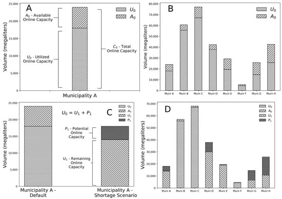 Graphical explanation of water source capacity and utilization before (0) and after (1) adaptation. (A) A municipality uses some portion of its legal, hydrological, and infrastructural capacity from a water source. (B) Multiple municipalities share a water source, and each uses and reserves some portion of the water source. (C) If there is a mandatory water curtailment, post-curtailment total capacity may be less than pre-curtailment utilization, creating a structural water deficit made whole by securing a “potential” source of water to fill the deficit (the potential source could be a conservation offset). (D) In a metropolitan area, a water curtailment scenario may affect each municipality differently, such that some municipalities still have available water from baseline sources, but other municipalities face structural water deficits.