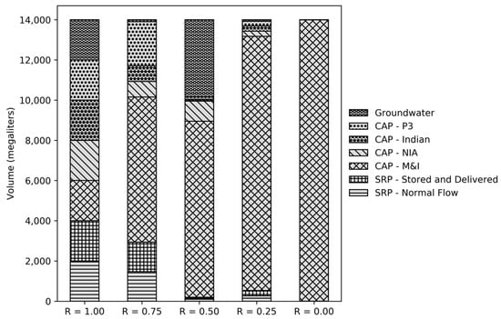 In the PMA, CAP water has most exposure to water stress due to its junior status on Colorado River [,]. CAP water right types are Municipal and Industrial (M&I) Subcontracts, water leased directly to municipalities by the Central Arizona Water Conservation District; M&I Priority, which is CAP water obtained by municipalities for the purposes of M&I use as a result of a lease from the Gila River Indian Community; CAP Agricultural Priority, which is water originally decreed for agricultural purposes on Native American reservations in Central and Southern Arizona but later obtained by municipalities by lease or exchange; CAP Non-Indian Agriculture, which is water originally decreed for agricultural purposes Central and Southern Arizona but later obtained by municipalities by lease or exchange; and CAP Priority water (P3), which is water obtained by municipalities via an exchange with the Wellton-Mohawk Irrigation District located in Yuma County for main stem Colorado River water, thus giving these water rights priority over other types of CAP water []. Among CAP water rights types, P3 & M&I water rights have the highest priority, followed by Agricultural and NIA water rights [,]. In the SRVC model, surface water delivered to PMA municipalities is considered in C0 and A0 (see Tables S1–S8 in supplementary materials).